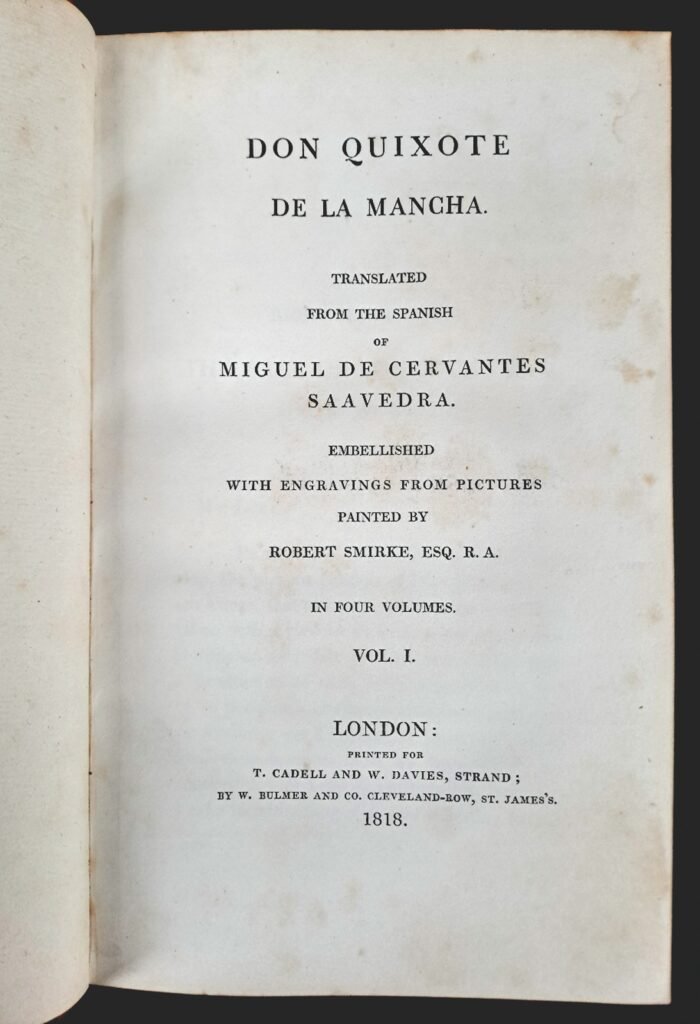 Esteemed edition of “Don Quixote,” illustrated and translated by a father and daughter team, engraved from paintings of Robert Smirke and translated by her daughter Mary Smirke.